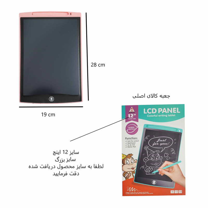 سایز 12 اینچ قابلیت نوشتن و نقاشی کشیدن با استفاده از قلم مخصوص دارای دکمه خاموش و روشن می باشد که با فشردن تمام محتوای صفحه پاک میشود باتری در داخل محصول موجود می باشد مناسب برای اموزش الفبا ، اعداد ، نقاشی و ... با این محصول بار ها بار ها نقاشی بکشید و پاک کنید دارای بسته بندی جعبه ای مناسب هدیه